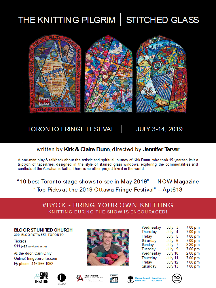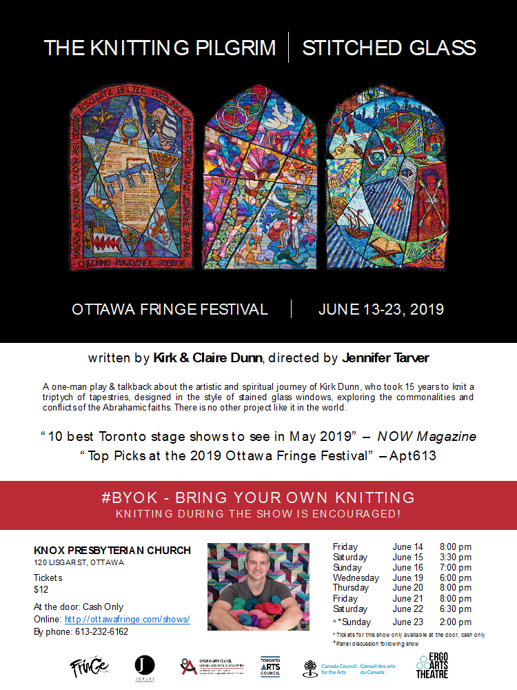 Now we’re gearing up to perform in The Ottawa Fringe Festival, June 13-23, at Knox Presbyterian. Eric Coates, Artistic Director of Great Canadian Theatre Company, chose The Knitting Pilgrim as one of four Fringe Picks on Apt 613. Here are show times: