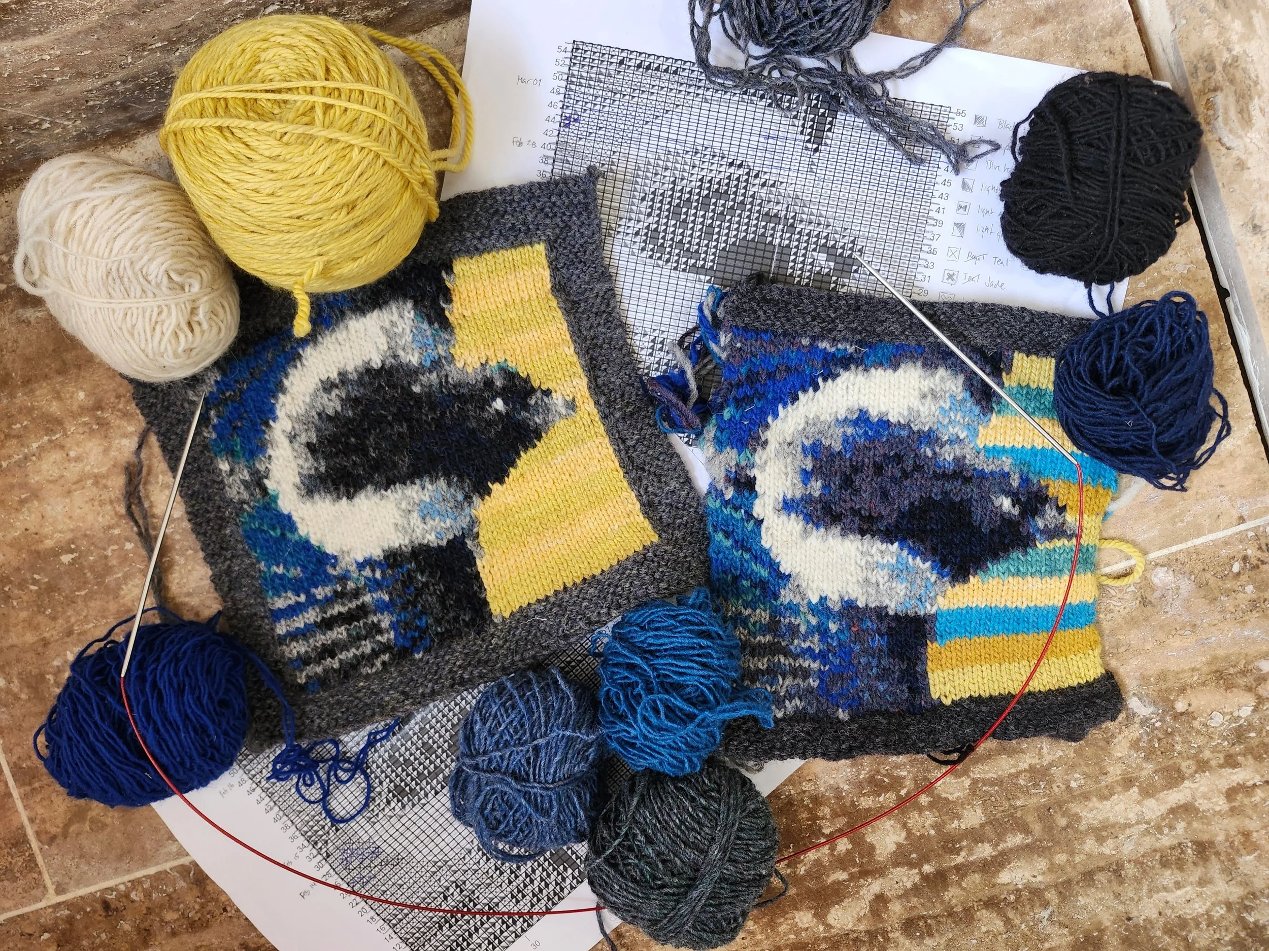 Let it be known that I love the colours of the yarn I’m using – Sport Weight 100% wool (knit double) from Briggs & Little for the magpie, and Merino hand-dyed in Goldenrod by Cabin Boy Knits for the background. My challenge is in figuring out how to combine them.