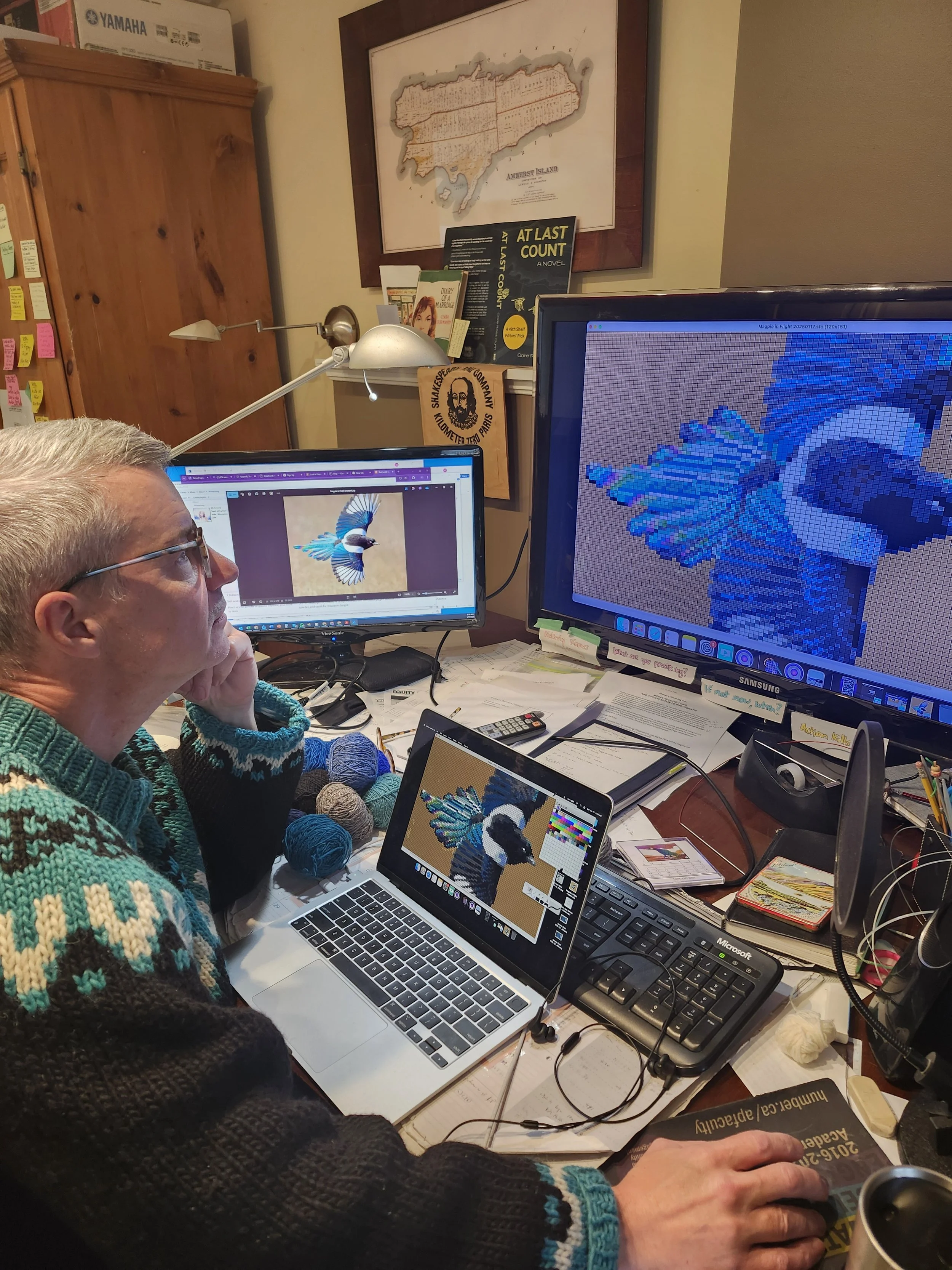 There happens to be another avian presence in Lost in France, too: a magpie. And so, I am knitting a pillow: Marlow’s Magpie. Here I am working on the pattern in January, so that I would have something to knit as I accompanied Claire on a research trip to Paris as she works on the sequel to Lost in France. Yes—she’s already working on the next book in the series. Pretty exciting, if you ask me.